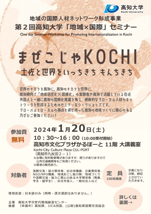 1月20日は「まぜこじゃKOCHI」に出店(かるぽーと) 終了イベント X Facebook はてブ LINE Pinterest コピー 2024.01.182024.03.24 1月20日(土)は第2回高知大学「地域×国際」セミナー まぜこじゃKOCHI 土佐と世界をいっちきち もんちきち 場所:高知市文化プラザかるぽーと に出店します。 詳細は よろしくお願いします。